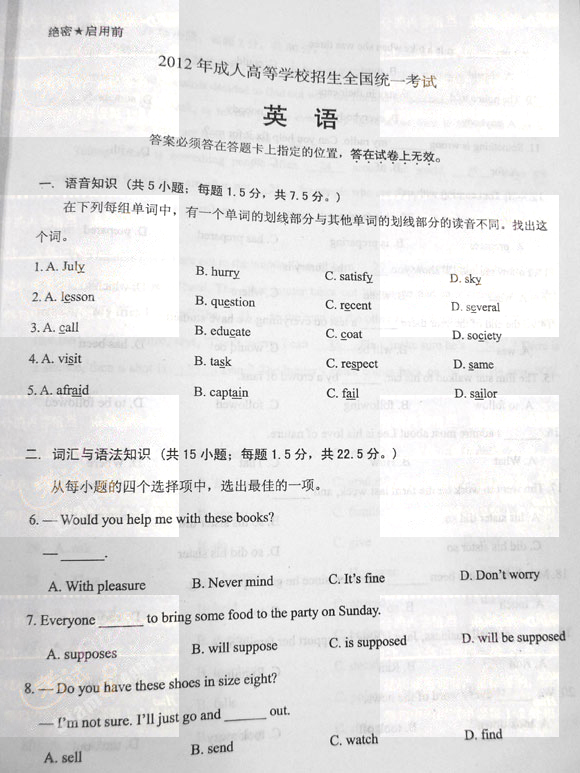 2012年成人高考高起点英语真题(word版)