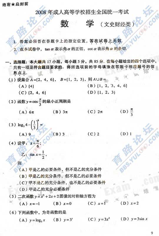 2008年成人高考高起点数学(文)真题及答案