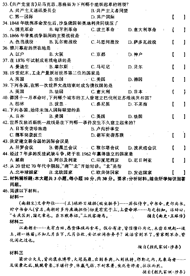->[成人考试]2001年全国成人高校招生考试历史试卷及参考答案 (450字)