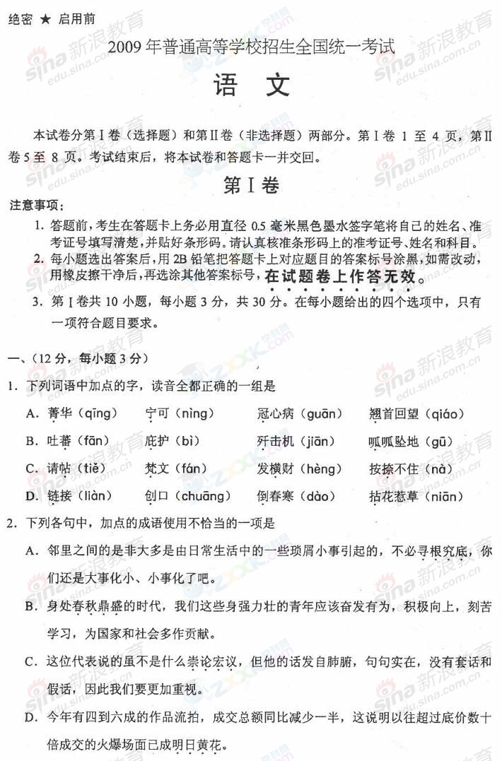 2009年高等学校全国统考语文试题(全国I卷)