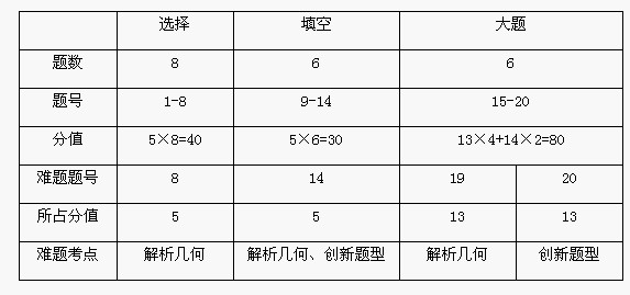 2012年北京高考延续8+6+6的试卷结构,即8道选择、6道填空、6道大题的形式,所占分值分别为40分、30分、80分。试卷由容易题、中等难度题、难题组成,并以中等难度题为主,总体难度适当。在此,有必要为高考试卷做一个简单的分析,如下表: