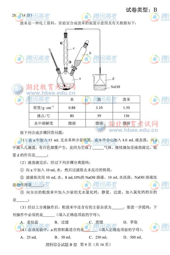 2012湖北高考理科综合B卷真题及答案(16)