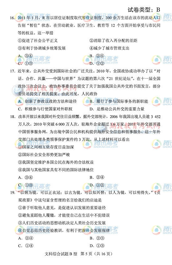 2012高考湖北卷B高考文综真题及答案公布(12)