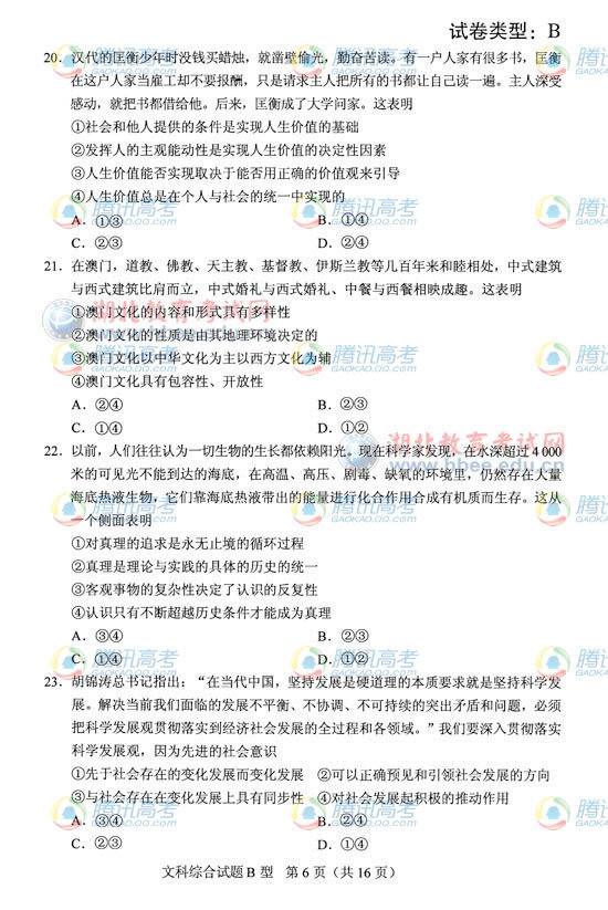 2012高考湖北卷B高考文综真题及答案公布(13)