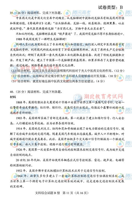 2012高考湖北卷B高考文综真题及答案公布(3)