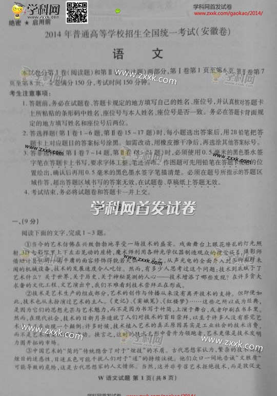 首发2014年安徽高考语文真题及答案(清晰版)(4)