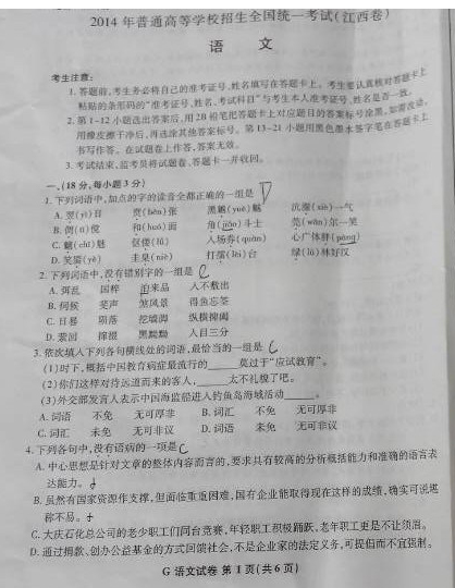 2014年江西高考语文真题及答案(图片版)