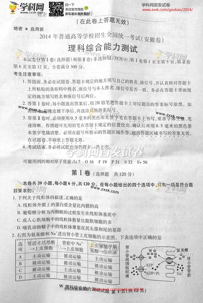 2014年高考安徽理科综合试题及答案解析(图文版)