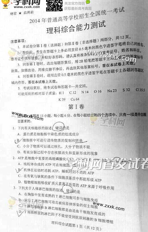 育路高考网第一时间发布最新的2014年广西高考理综试题及答案