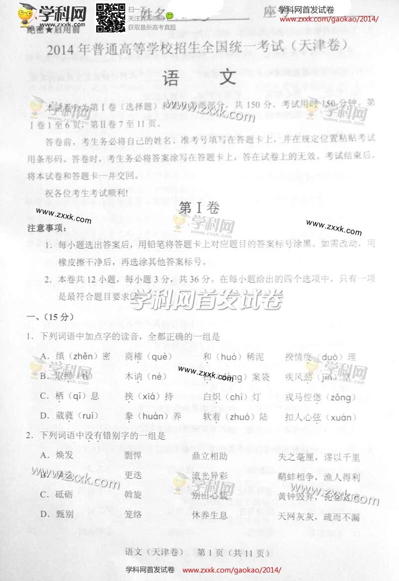 2014年天津高考语文试题(图文版)