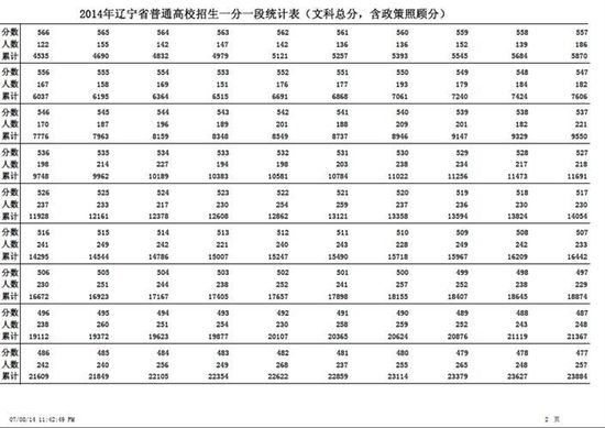 2014年辽宁高考文科一分一段统计表(含照顾分)(2)