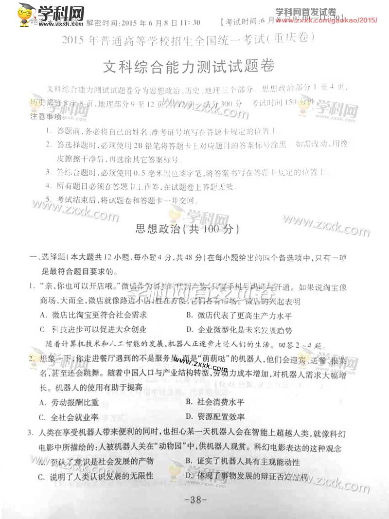 2015年重庆高考文科综合试题及答案解析