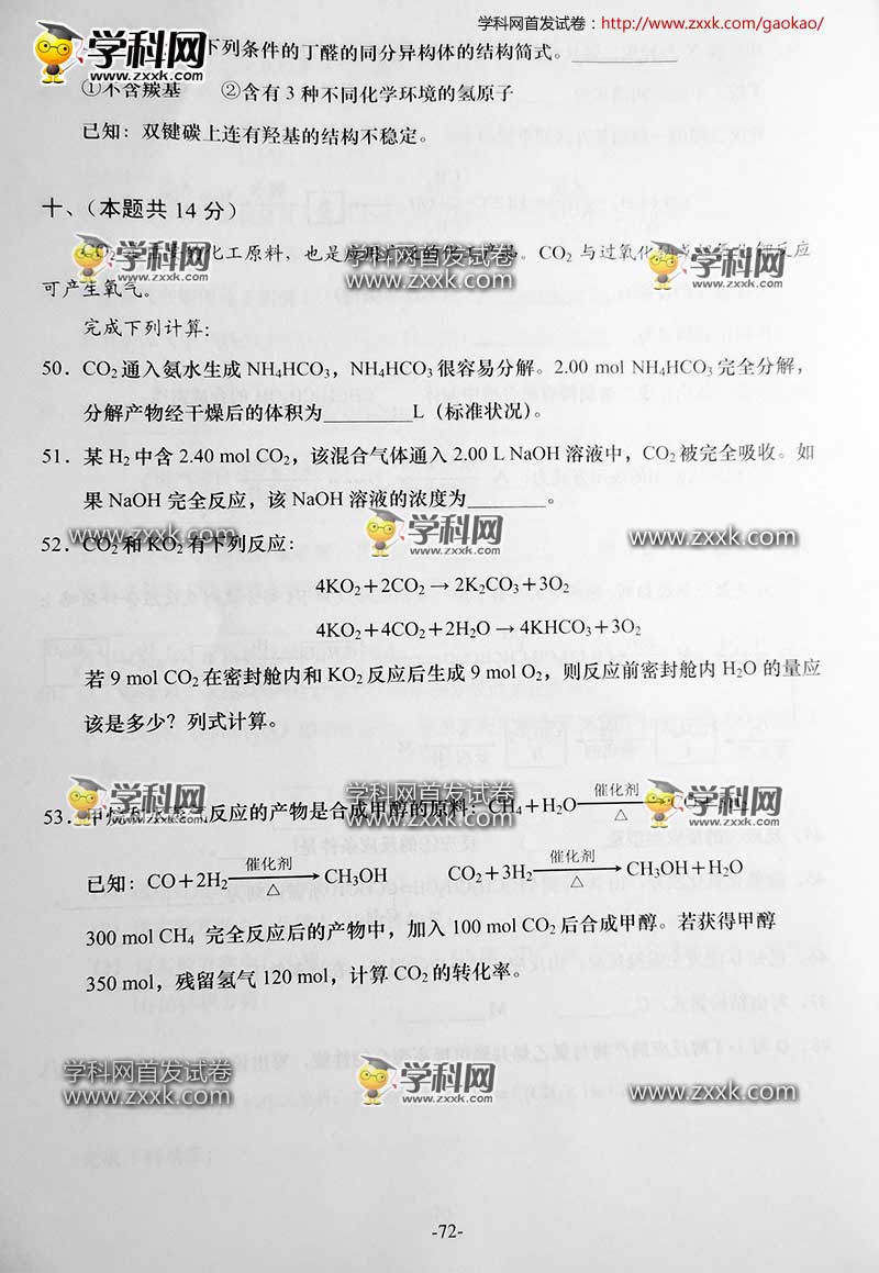 2016年上海高考化学真题及答案(10)