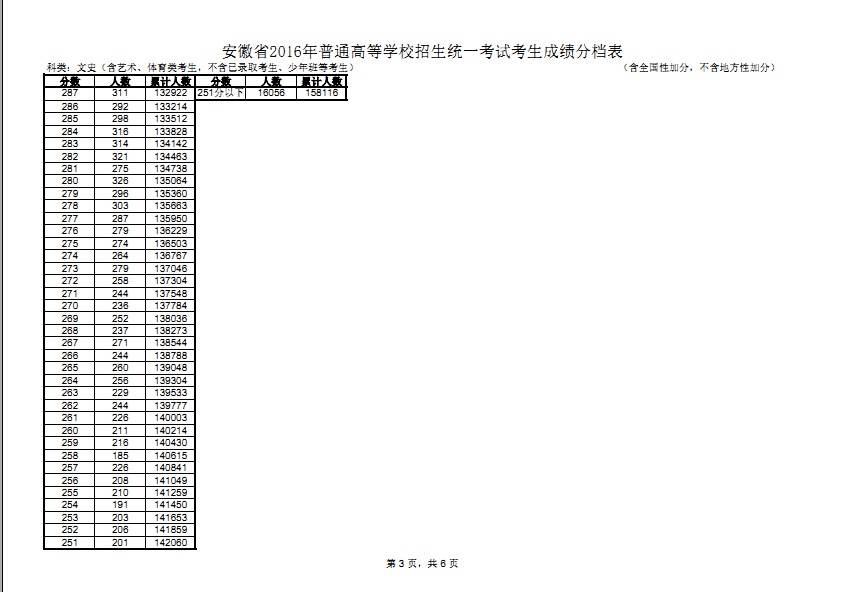 安徽2016年高考(文理科)各分数段一览表汇总(3)