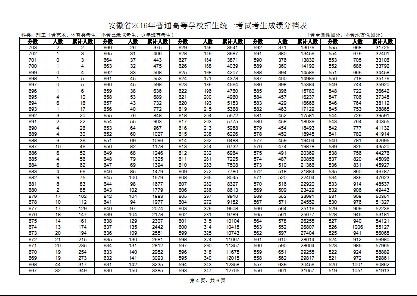 安徽2016年高考(文理科)各分数段一览表汇总(4)