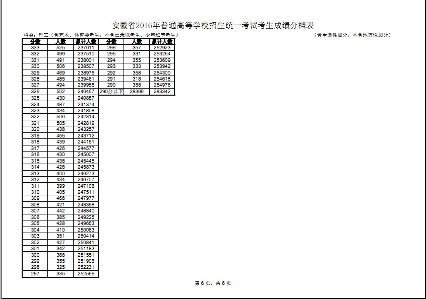 安徽2016年高考(文理科)各分数段一览表汇总(6)
