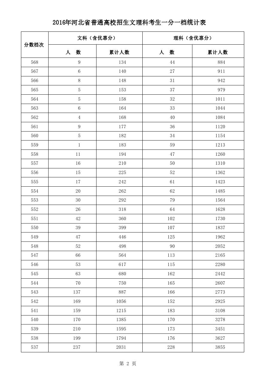 2016年河北高考文理科考生一分一档统计表(2)