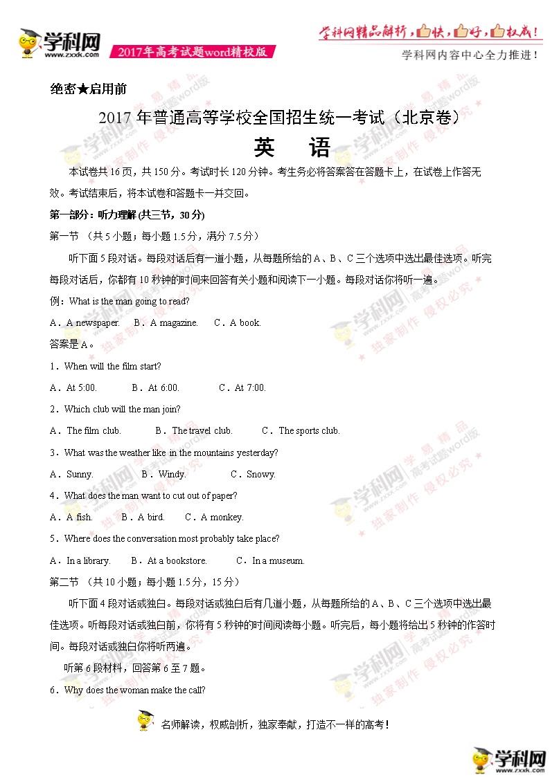 2017年北京高考英语真题及答案