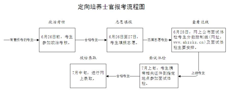 第五步,网上录取。省教育招生考试院从政治考核、体检和面试合格考生中,依据考生填报志愿和高考成绩,按照定向招生院校计划数100%投档。7月中旬,安徽招生考试网提供录取结果查询。