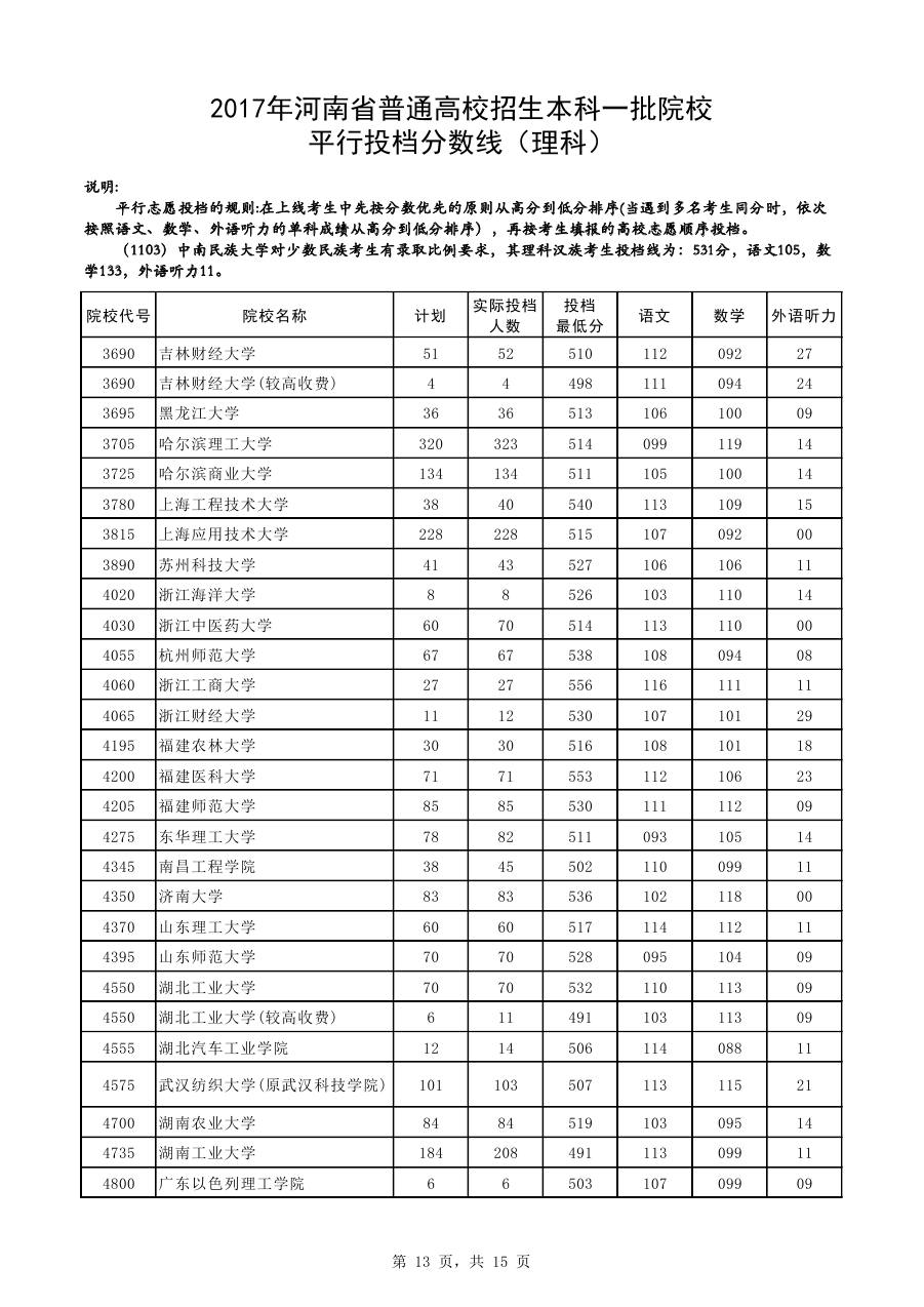 河南高考本科一批院校平行投档分数线(理科)(13)