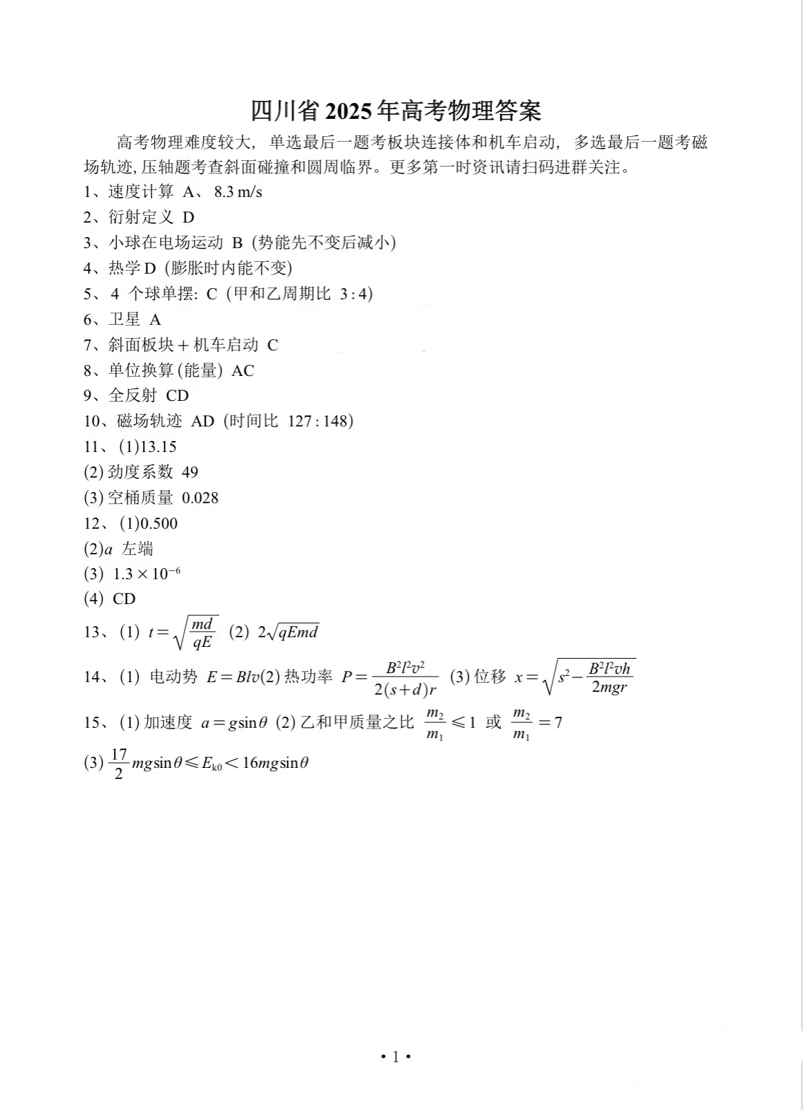 参考答案!2025年四川省高考语文及全科答案解析汇总