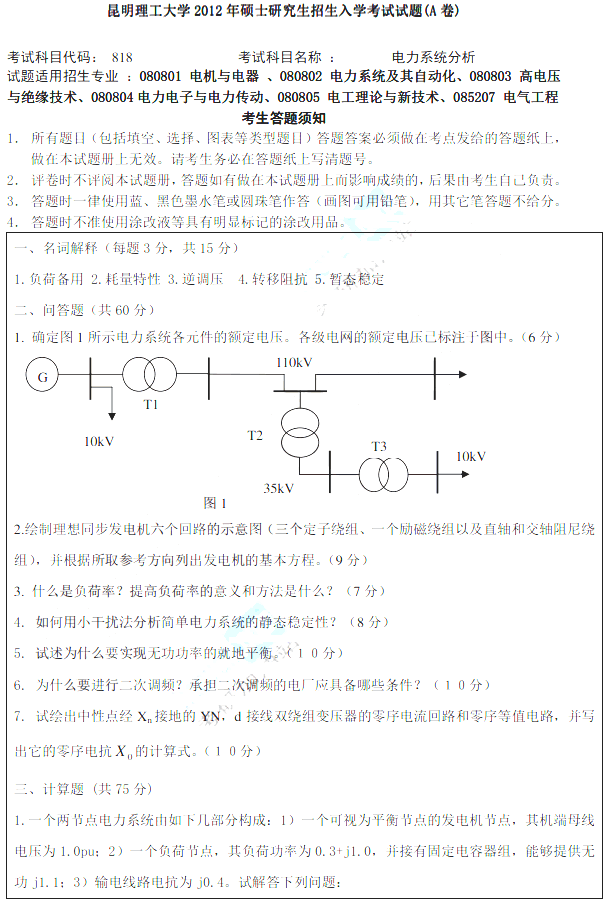 昆明理工大学2012年818电力系统分析考研试题试题