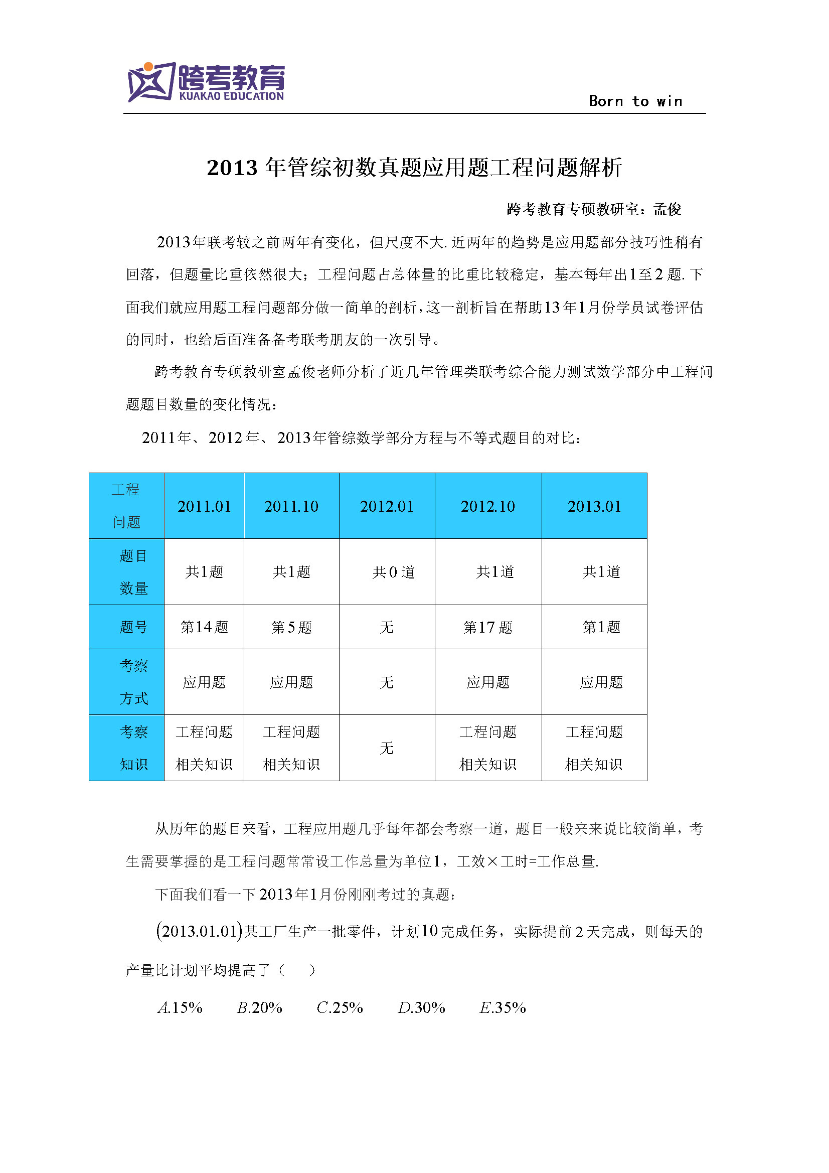 2013年管综初数真题应用题工程问题解析