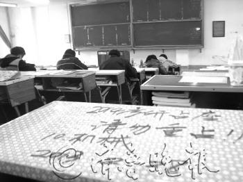 青大某教室课桌上写有“2014考研请勿重占”等字样。