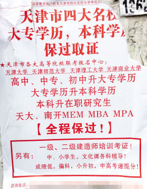 近日,想通过进一步学习进修获得在职研究生证书的市民齐先生向“小崔暗访工作室”反映,这几天自己被贴在小区内的一则招生广告所吸引。“上面印着一家名叫‘天津市各大高等院校联考报名中心’的教育机构,可以在天津市四大名校,广告中‘全程保过’四个字非常显眼。”令齐先生感到不靠谱的是,经过几番联系才找到的这家教育机构竟然当面承诺,只要把钱交到位,剩下的事他们办,不用来上课,比较后等着两年半后拿证,即使什么都不会,也能拿到在职硕士学位证书。