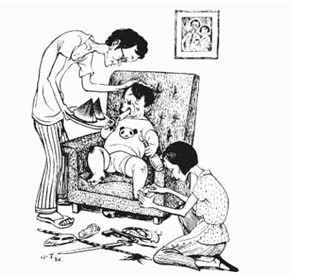 This drawing depicts a typical “little emperor” of a contemporary Chinese family. The fat son sinks comfortably into a soft sofa watching TV, while his father and mother, who are strikingly thinner, are feeding him watermelon and cutting his nails. No doubt, the boy is very spoiled being the center.
