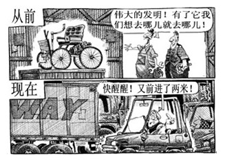 这一组图展示了汽车在我们的社会中曾经扮演过的两种截然不同的角色:几个世纪以前,人们在庆祝发明了一种如此快速的交通工具,有了它我们可以去任何我们想去的地方。但是现在,特别是在城市地区,汽车倒更是一种麻烦,因为数目巨大的汽车导致了频繁的堵车现象发生。第二副图中的司机在这场“灾难”中都睡着了。