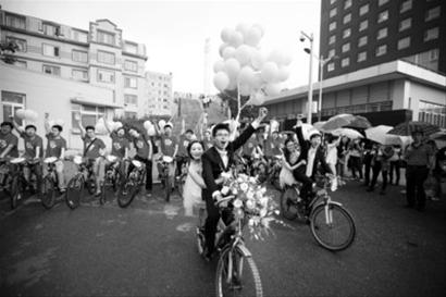 9时35分,新郎邢超带着30辆由自行车组成的迎亲车队,从北山学生公寓迎娶完新娘后,穿越整个理工校园,到达婚礼现场。一路上,这个车队成为校园比较美的一道风景,有大学生说:“这一刻,自行车赛过宝马!”