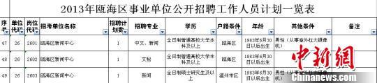 7月2日,一位网友“我吃肉包不吃肉”发博称:“现在扛摄像机都要研究生了。”微博后面还附上了“2013年瓯海区事业单位公开招聘工作人员计划一览表”的截图。
