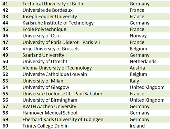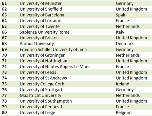 欧洲比较具创新力大学名列第二的是伦敦帝国学院,这所学院的科研人员曾经在青霉素的探索发现、全息影像技术的发展和光纤发明等方面做出过重要贡献。剑桥大学位列第三,在800年的建校史中其涌现出了91位诺贝尔奖得主。位居第四的慕尼黑工业大学自1990年以来成立了800多家附属企业,其中包括多家从事可再生能源,半导体和纳米技术行业的高新科技创业公司。