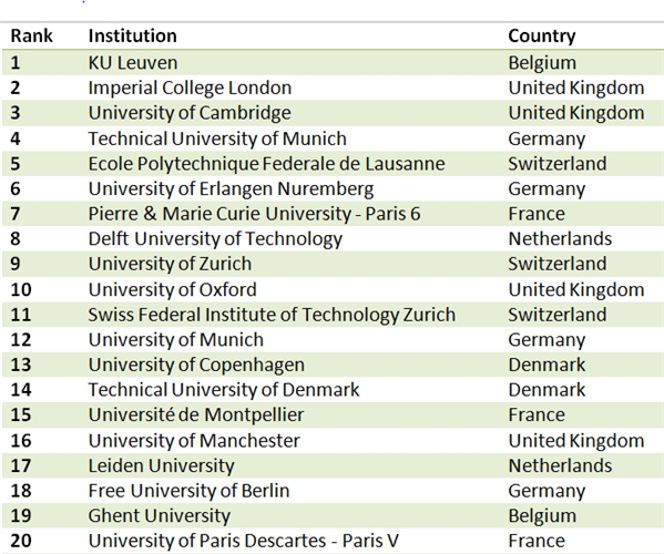 在今年比较新出炉的榜单中,比利时的荷兰语天主教鲁汶大学 (KU Leuven)荣登欧洲比较具创新力大学榜单的榜首。这个拥有近600年历史的教育机构比较初由教皇马丁五世创立,但在今天其科技水平比神学更为人所知:运维着全球比较大的独立研发机构之一的比利时荷兰语天主教鲁汶大学,在2015财年,科研开支超过4.54亿欧元,其现有的专利组合包括586个活跃的专利家族(active families),它们每个都是受到多国保护的专利发明。