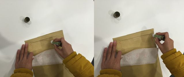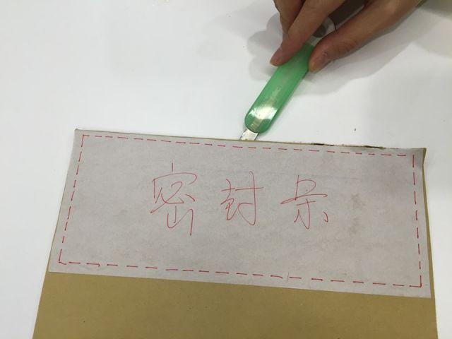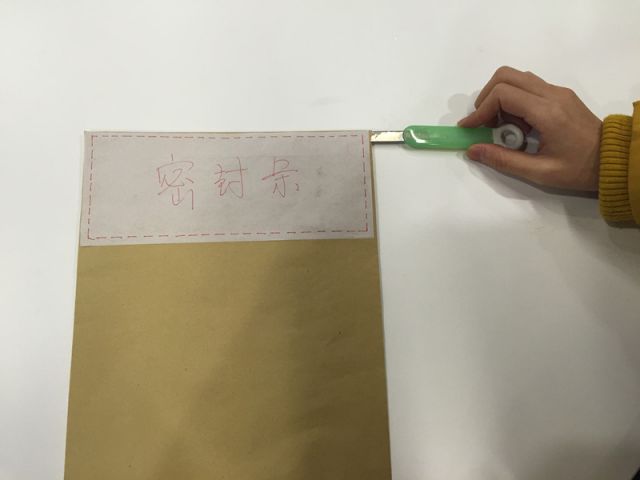 (1)从信封一侧将小刀插进去,切一个小口,避开里面那个舌头;
