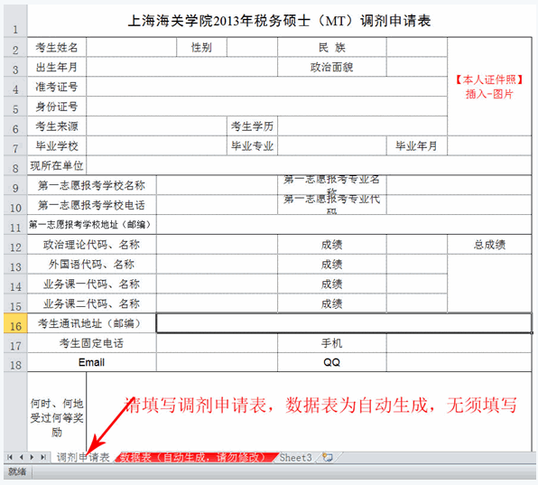 上海海关学院2013年税务硕士(MT)调剂申请表.xls