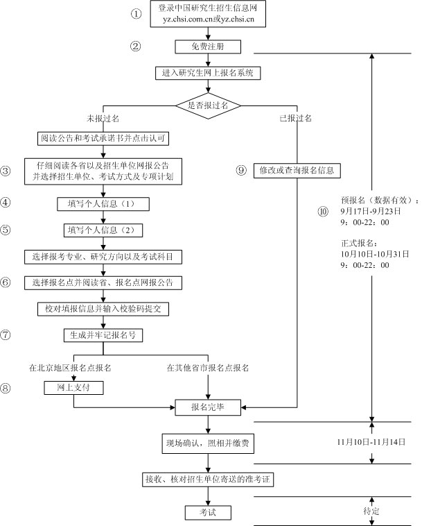 ⑨ 修改或查询自己的报名信息,其中招生单位、考试方式及报考点信息是不可修改的内容;请在网报结束前登录确认所填信息,建议将所有信息保存;在北京地区报考点报考的考生请检查网上支付是否成功;
