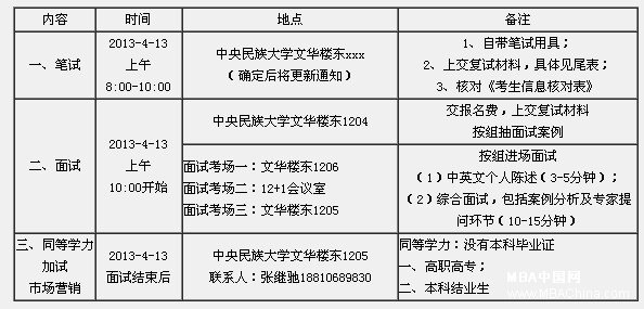 三、复试对象:第一志愿报考中央民族大学,且符合第2项规定者。总分165分以上(含165分),单科成绩达到国家分数线。(请符合条件的考生,在我中心公布复试具体时间后,准时前来参加复试。由于考生人数众多,中央民族大学MBA教育中心不另行个人通知)