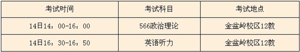 复试笔试考场安排与初试考试考场相同,每个考场安排30人。考试教室均安排在金盆岭校区12号教学楼。