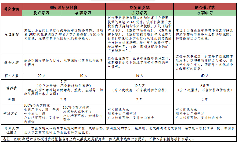 2016年中国农业大学计划招生160人。分为期货证券班、国际项目班和综合管理班三个方向,mba学制均为两年。其中期货证券班学费为12.8万元,国际项目班学费7万,综合管理班学费5.6万元。