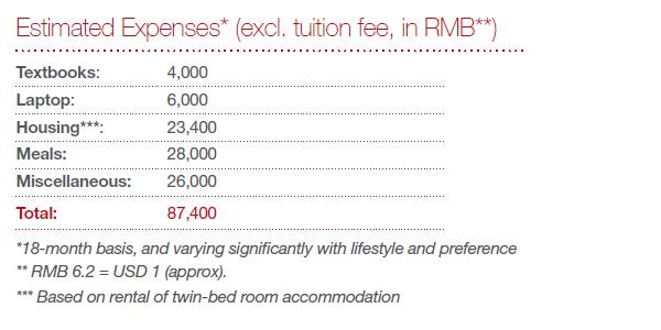 此外,学生还需根据个人实际情况支付书费、伙食费等费用。学院要求每位学生必须自备一台手提电脑,供上课使用。同时,学生还可以利用遍布学院的网络接口,充分享用网络资源。预估费用如下:
