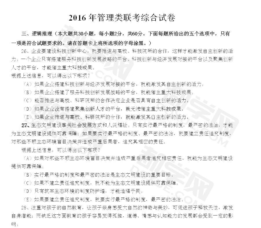 对于参加2017年MBA联考的考生来讲,真题非常重要,考生可以通过真题掌握阅卷老师的出题方向,下面我们就给大家整理了一份2016年MBA联考逻辑真题,以供参考。