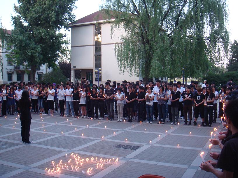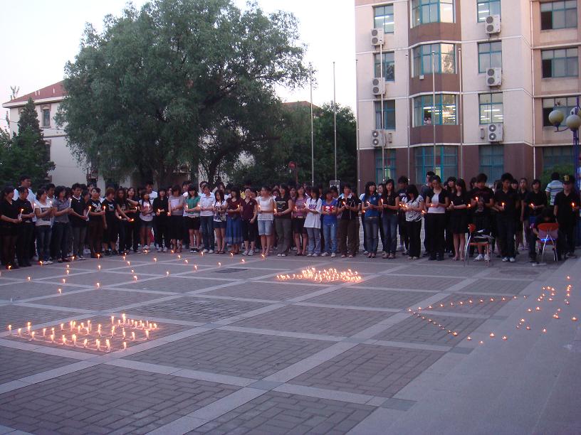 晚上19:00北方工商管理学院全校关灯。我们在烛光下,默哀了。其实今天下午2点28分的时候,班中的一部分同学已经默哀了。包括我。默哀一分钟。结果今晚,有那么多同学到场支持这个有意义的活动,我都忍不住流泪了。确实,5月12日这一天,给中国人带来太大的伤痛了。我想我这一辈子都不可能忘记这一天。在默哀的过程中,一位老师的小孩发出了声音。虽然,在这个场景有声音很格格不入。但是小孩子的声音不正是一种新生的声音吗?沉默中的一声稚嫩,是一种希望!!我听到了希望!!