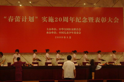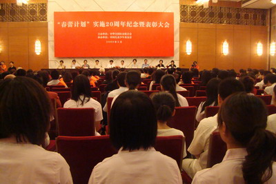 “春蕾计划”实施20周年纪念暨表彰大会于2009年5月31日下午2点30分在人民大会堂隆重举行。北京培黎职业学院获得全国妇联颁发的“中国儿童慈善奖”,院长、党委书记余临代表学院上台领奖。常务副院长尤锡良、学院董事会办公室主任杨彦青、财会金融系主任黄贤明、财会金融系副主任兼春蕾班班主任刘乐山等参加了会议。北京培黎职业学院2008级春蕾班31名同学参加会议,并担任了大会的礼仪服务。