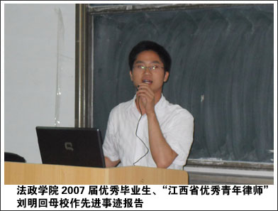 6月8日晚,北京吉利大学法政学院2007届优秀毕业生、“江西省优秀青年律师”刘明回母校北京吉利大学作先进事迹报告。北京吉利大学法政学院院长李秀娟莅临报告会现场,院长助理吴贻斌主持报告会。北京吉利大学法政学院300余名学生聆听了报告,反响热烈。