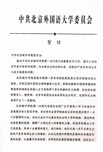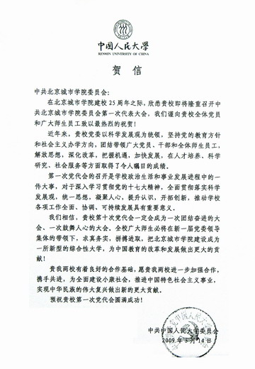 我校第一次党代会即将召开的消息传出后,首都各兄弟院校给与热情关注,在京中央部委所属高校和市属高校党委纷纷以贺信、贺电等形式祝贺我校党代会召开,多所院校领导在发来贺信同时又专门致电我校领导表示祝贺,有的还专门委托校党办负责人送来贺信。兄弟院校在贺信、贺电中充分肯定了我校取得的巨大成绩,对学校的未来致以美好祝愿。这些贺信、贺电充分体现了我校与兄弟院校的深厚情谊,充分体现了社会各界对我校的殷切期待。这必将成为学校今后发展的强大精神动力。截止5月14日中午12时,发来贺信、打来贺电的兄弟院校有(以下排名不分先后):