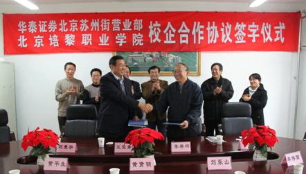 在培黎职业学院深入学习实践科学发展观活动中,11月27日上午,在培黎学院办公楼会议室,副院长李培均代表北京培黎职业学院与华泰证券股份有限公司北京苏州街证券营业部投资部经理王宝青就双方合作培养金融与证券专业人才签订了框架协议,双方表示要切实加强各个领域合作和开发,为校企双方的发展,共同培育人才创造条件。华泰证券股份有限公司北京苏州街证券营业部领导,培黎教务处处长张桂花、实习实训中心副主任李伟丽,财会金融系主任黄贤明,副主任刘乐山、黄平生参加签约仪式。学院副院长、党委副书记翟天利主持了签约仪式。
