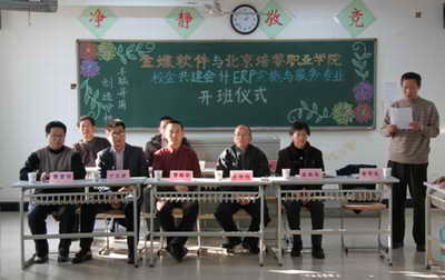 在培黎学院学习实践科学发展观活动的热潮中,2009年11月27日14时,北京培黎职业学院与金蝶软件(中国)有限公司北京分公司共建的会计(ERP实施与服务)专业的开班仪式在3号教学楼205教室隆重举行。金蝶软件(中国)有限公司北京分公司服务与培训教育部总监曹维安、北京分公司培训教育部经理丁文君等有关领导,北京培黎职业学院副院长李培均、教务处处长张桂花,财会金融系主任黄贤明,副主任刘乐山、黄平生,2009级高职会计5班的40名同学参加了开班仪式。财会金融系副主任黄平生主持了开班仪式。