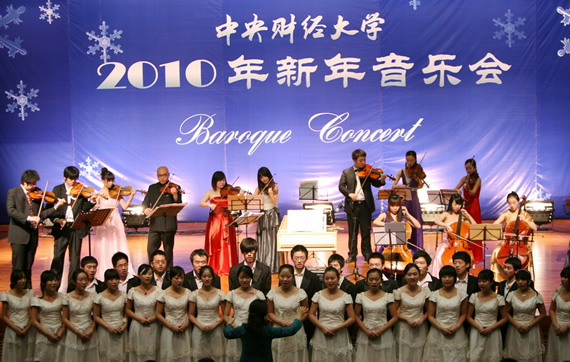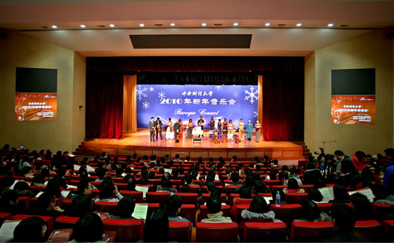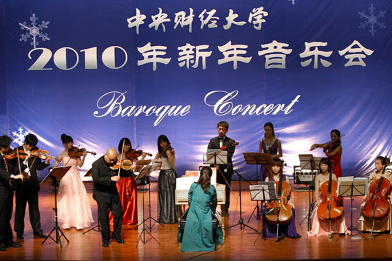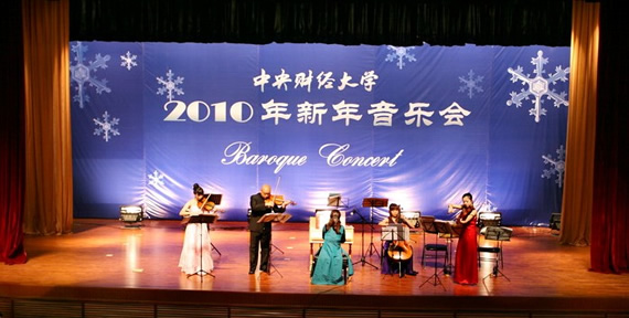 12月29日的学术会堂弦乐齐鸣,韵律悠扬,700余名师生员工沉浸在高雅音乐的浓浓氛围之中。作为学术会堂落成后举办的首场音乐会,中央财经大学2010年新年音乐会在这里精彩上演。学院党委副书记侯慧君,校长助理赵丽芬与师生员工一道欣赏了由沈凡秀巴洛克室内乐团演奏的音乐会,共同在音乐中迎接新年的到来。